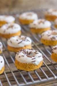 These Mini Baked Pumpkin Chocolate Chip Donuts are perfectly bite-sized and will have you ready for Fall in no time!