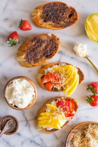 You’ll love these thick slices of cinnamon toast topped with whipped cream cheese, mango and strawberry slices, toasted coconut, and chia seeds.