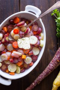 A beautiful trio of purple, white, and orange carrots roasted to tender perfection and finished off with honey and butter.