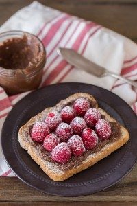 Homemade chocolate hazelnut spread on toast with fresh raspberries and powdered sugar.