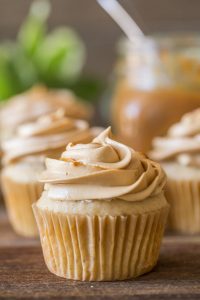 Sweet and tart apple cupcakes are topped with a buttercream and Dulce de Leche swirl! Match made in heaven!