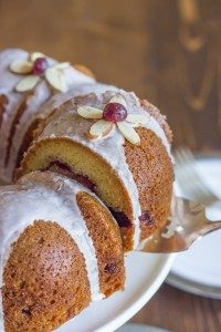 Sweet, moist almond cake laced with cranberry sauce and topped with an almond glaze.