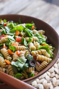 Classic summertime pasta salad lightened up with a mix of chopped baby spinach and veggies, tossed lightly with an easy balsamic vinaigrette.