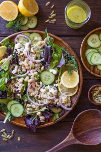 Baby greens, Israeli couscous, feta, dill, white beans, cucumber and pepitas make this salad light, fresh and healthy!