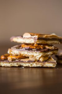 This Take Five Cracker Bark has a butter cracker base with layers of caramel, chocolate, peanut butter, pretzels and peanuts! So delicious and addicting!