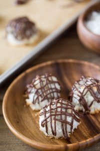 Coconut macaroons flavored with vanilla and almond, stuffed with a mini sized candy bar and drizzled with chocolate!